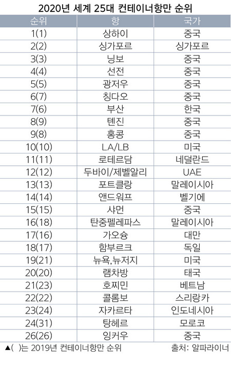 알파라이너 측은 “지난해 중국 다롄과 잉커우항은 과잉 생산량을 줄이기 위해 통합됐다”며 “이 같은 흐름은 컨테이너 허브 항만간 경쟁력 강화를 위해 계속될 예정”이라고 분석했다. 실제로 중국의 주요 항만들의 입지는 더욱 확대되고 있는 가운데 상위 25대 항만에 속한 중국 항만의 개수는 계속 줄고 있다. 불과 2년 전만 해도 25대 항만에 속한 중국 항만은 총 11곳이었으나 현재는 9곳이다.