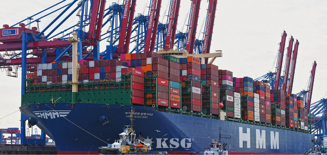 | ▶ HMM의 2만4000TEU급 컨테이너선 <에이치엠엠알헤시라스>호가 독일 함부르크항에서 화물을 하역하고 있다. |
