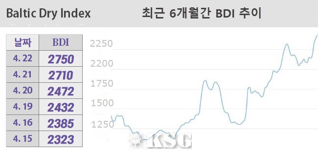 4월22일 건화물선 운임지수(BDI)는 2750을 기록했다. 이날 벌크 시장은 케이프선과 수프라막스선은 상승세를 이어갔지만 파나막스선은 하락세로 전환됐다. 외신에 따르면 케이프선은 중국에서 철광석 수요가 꾸준해 태평양 수역은 물론 대서양 수역에서도 강세가 지속되고 있어 운임 인상의 폭이 확대되고 있다, BDI는 전일보다 40포인트 상승했다.