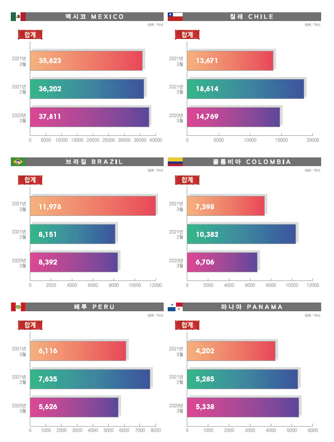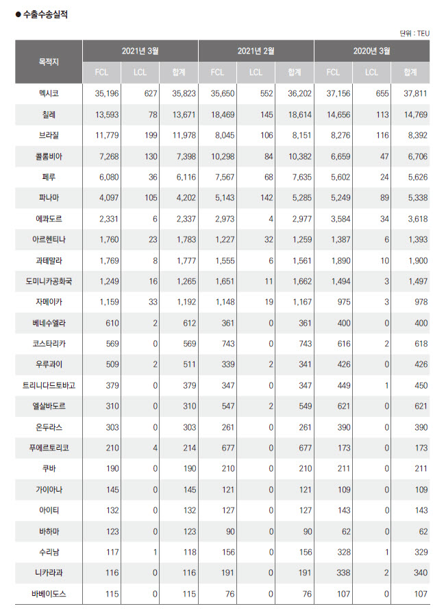 정기항로브리핑/ 중남미항로 수출수송실적(2021년 3월/전월/전년)