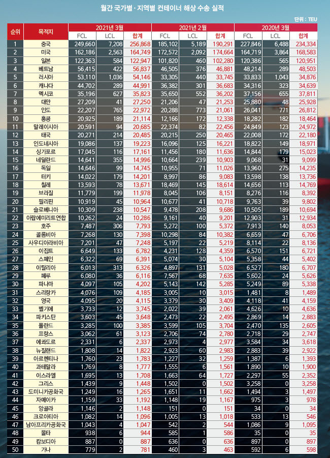 정기항로브리핑/ 월간 국가별 컨테이너 해상수출실적 1~50위 (2021년 3월/전월/전년)