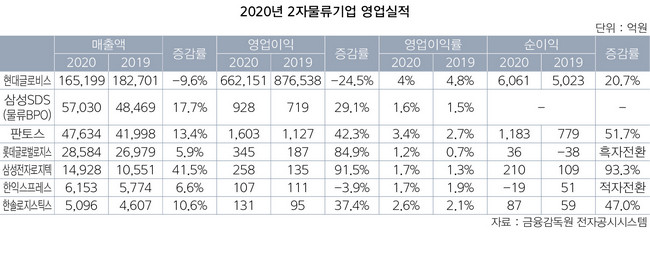 코로나19 사태가 휩쓸고 간 지난해 국내 주요 2자물류기업 7개사가 서로 엇갈린 성적표를 내놓았다. 현대글로비스를 제외한 나머지 6개사는 모두 외형이 커졌다. 삼성전자로지텍 판토스 롯데글로벌로지스 삼성SDS(물류BPO) 한솔로지스틱스 등 5개사는 매출액과 영업이익이 모두 증가했다. 한익스프레스의 경우 외형은 성장했으나 수익성은 악화됐다.