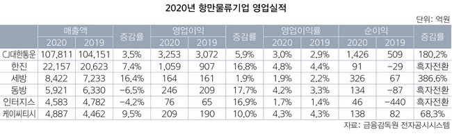 코로나19발 깜짝 특수 덕에 지난해 국내 주요 항만물류기업들의 수익성이 큰 폭으로 개선됐다. 동방과 인터지스를 제외한 나머지 4개사는 외형 성장도 신고했다. 한진 동방 인터지스 등 3개사는 순이익이 흑자 전환에 성공했다. 이들은 대체로 수익성 위주의 내실 경영을 통해 경영 효율화를 도모하면서 수익 개선에 힘을 쏟았다.