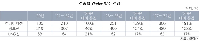 같은 기간 컨테이너선은 1만5000TEU급 이상 대형선을 중심으로 2020년 105척 대비 최대 2~3배 증가한 250~300척이 매년 발주돼 한국 조선업이 반사이익을 거둘 것으로 보인다.
