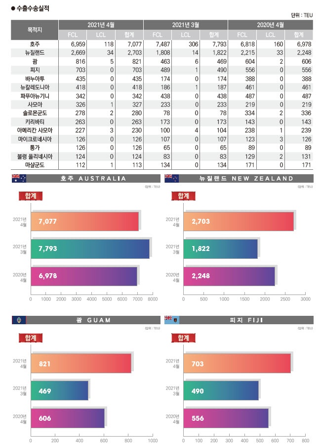 정기항로브리핑/ 호주항로 수출수송실적(2021년 4월/전월/전년)