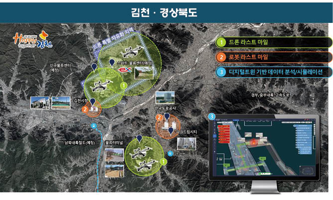 선정된 김천시·경상북도는 로봇·드론배송 등 교통안전 디지털 물류혁신도시로 물류센터와 배송지간 드론 배송, 공공건물·오피스텔을 대상으로 자율형 물류로봇 배송서비스를 실증하고 디지털트윈 기술을 활용해 실증 과정상에서의 정보를 수집한다는 구상이다. 그 결과를 분석해 시뮬레이션 등을 통해 최적 운송 솔루션 모델을 구축할 예정이다.