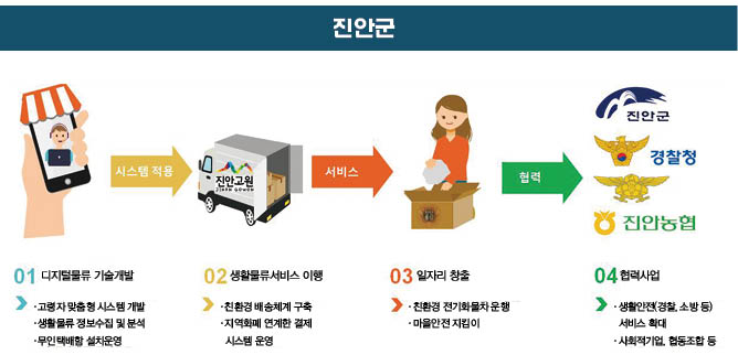 진안군은 농촌마을(진안 마령 주천 등)을 대상으로 공동 보관함을 설치하고 순회 집화 서비스를 통해 농가에서 직접 발송지까지 가져와야 하는 어려움을 해소하고, 지역화폐와도 연계해 결제서비스도 편리하게 이용할 수 있도록 할 계획이다. 또한 단계적으로 독거어르신 돌봄서비스, 로컬푸드 납품, 주민 간 식자재 나눔 등 생활안전 서비스와 연계해 나갈 계획이다.