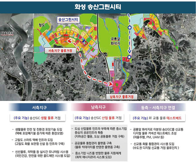 디지털 물류시범도시 조성 지원 사업으로 화성 송산그린시티는 지구 특성을 반영해 남측지구는 미래운송 클러스터 등 산업물류 기능에 초점을 두고, 서측지구는 주거, 상업 등 복합개발을 고려해 환경친화형 물류체계 구현에 중점을 두어 계획을 수립할 예정이다.