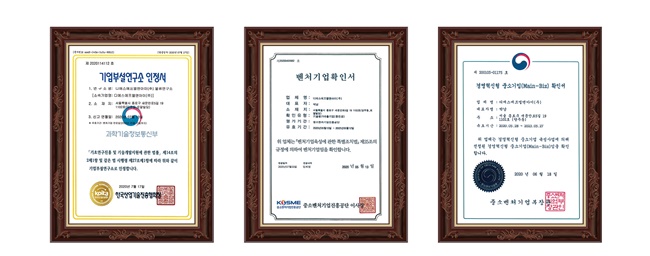 | ▲DSF L&I가 획득한 인정서와 확인서. 왼쪽부터 기업부설연구소 인정서, 벤처기업 확인서, 경영혁신형중소기업 확인서 |