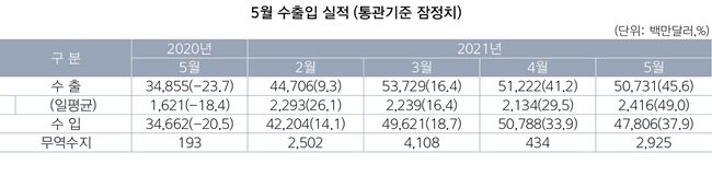 5월 수출액은 45.6% 증가한 507억3000만달러(약 56조4400억원)를, 무역수지는 29억3000만달러로 13개월 연속 흑자를 이어갔다. 5월 수출은 32년 만에 가장 큰 폭을 증가했으며, 2개월 연속 수출이 40%대를 기록한 건 사상 처음이다. 일평균 수출도 49% 증가한 24억2000만달러를 기록, 2018년 이후 처음으로 24억달러를 넘어섰다.
