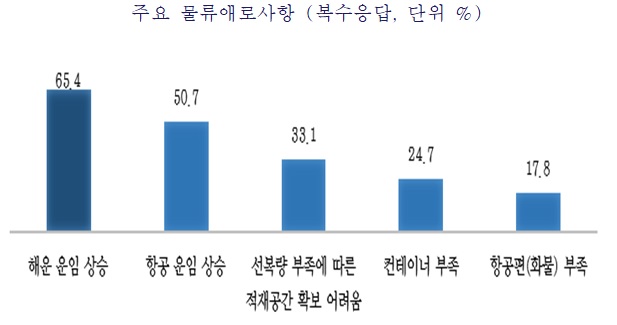 주요 물류 애로로는 해상운임 상승이 65.4%로 가장 많았다. 뒤이어 항공운임 상승(50.7%), 선복 부족(33.1%), 컨테이너 부족(24.7%), 화물 항공편 부족(17.8%) 순이었다.