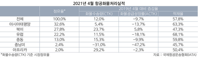 국제항공운송협회(IATA)에 따르면 올해 4월 전 세계 항공사가 취급한 화물수송량(CTK·톤킬로미터)은 재작년 같은 시기보다 12% 증가한 것으로 나타났다. 계절성(Seasonally adjusted) 화물수요가 회복세를 띠면서 실적 증가에 기여했다는 분석이다. 이는 계절성 화물수요가 가장 높았던 2018년 8월보다도 5% 상승한 수준이다.