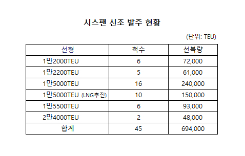 이로써 시스팬이 지난해 12월 이후 발주한 신조선단은 1만2000TEU급 6척, 1만2200TEU급 5척, 1만5000TEU급 16척 LNG연료 추진 1만5000TEU급 10척, 1만5500TEU급 6척, 2만4000TEU급 2척 등 45척 66만4000TEU에 이른다. 별도로 1만5000TEU급 중고선박 4척 매입을 발표해 이 중 2척을 인도받았다.