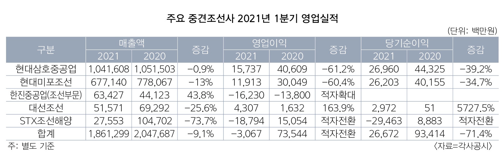 1분기 5개 조선사의 매출총액은 전년 대비 9% 감소한 1조8612억원에 그쳤고, 영업이익 합계는 지난해 735억원에서 올해 -30억원으로 적자 전환했다.