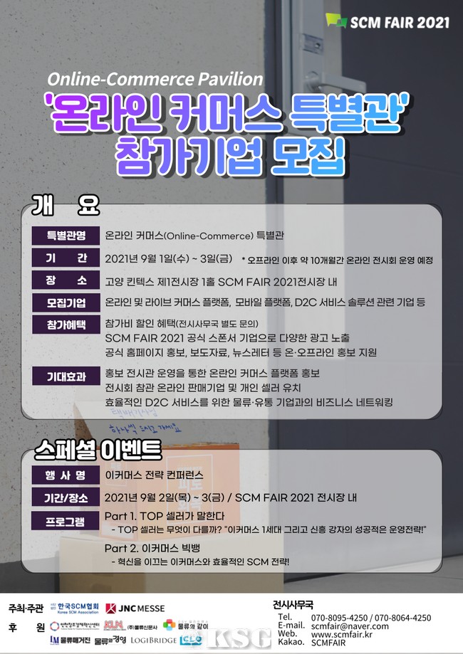 SCM FAIR 주최사무국인 주식회사 제이앤씨메쎄는 오는 9월 개최되는 ‘SCM FAIR 2021‘ 전시회에 ‘온라인 커머스 특별관(Onilne Commerce Pavilion)’을 운영한다고 밝혔다.