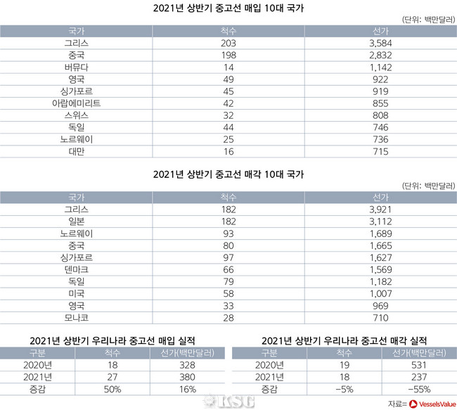 지배선대 기준 세계 5위 해운국인 우리나라는 중고선 거래에선 부진한 모습을 보였다. 우리나라는 올해 상반기 동안 27척 3.8억달러를 사들이고 18척 2.4억달러를 내다 판 것으로 집계됐다. 10위권에도 들지 못한 수치다. 1년 전에 비해 매입은 선가 기준으로 16% 늘어난 반면 매각은 반 토막 나는 하락곡선을 그렸다. 지난해 우리나라에서 사들인 중고선은 18척 3.3억달러, 내다 판 중고선은 19척 5.3억달러였다.