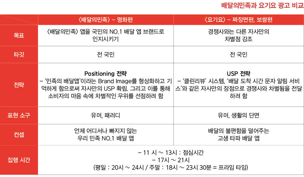 배달의민족 광고와 요기요 광고를 집중적으로 분석한 결과, 총 63명의 사람은 배달의민족 광고 중에서 류승룡이 출연하는 명화 편을 봤다. 이 중 57명이 광고가 전달하고자 하는 의미를 이해했고 55%의 사람들이 광고를 접한 뒤 애플리케이션을 다운받았다. 반면 배달의민족과 비슷하게 62명의 사람이 요기요 광고를 봤다. 요기요 광고가 전달하고자 하는 의미를 59명이 이해했지만, 애플리케이션을 다운받은 사람은 17%에 그쳤다. 그뿐만 아니라 전반적으로 사람들은 배달의민족 광고가 요기요의 광고보다 더 기억에 남는다고 답변했다.