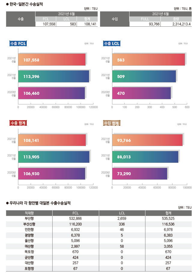 정기항로브리핑/ 한일항로 컨테이너 수출수송실적(2021년 6월)