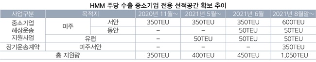 ‘HMM 협업 중소기업 해상운송 지원사업’을 통해 제공되는 중소기업 전용 선적 공간은 450TEU에서 700TEU로 증가한다.