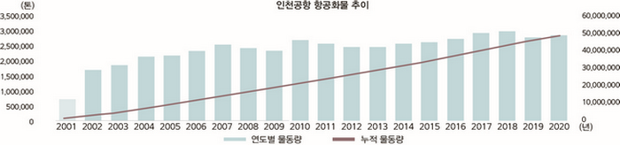 2001년 120만t이었던 인천공항 항공화물 물동량은 매년 실적이 점차 개선되면서 2007년 255만t까지 기록했다. 지난 2008년 미국 금융 위기 여파로 물동량이 2009년 231만t까지 하락하기도 했다. 다만 전 세계 경기가 점차 회복되면서 지난 2018년엔 개항 후 최대 실적인 295만t을 달성하는 등 소폭의 등락을 거듭하면서 전반적인 실적 상승 추세에 있다.
