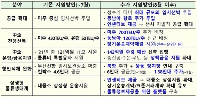 정부는 현재 물류 상황의 심각성을 인식하고, 수출에 차질이 발생하지 않도록 다음과 같은 추가 지원대책을 마련했다. 산업부는 “이번 대책은 특히 현장 상황과 업계의 요청사항들을 적극 수렴해 다음 분야에 중점을 두고 추진할 계획”이라고 전했다.
