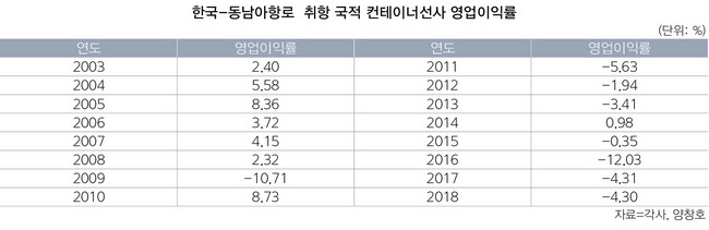 실제로 2009년부터 2018년까지 10년간 11개 국적선사의 영업이익률은 2010년과 2014년을 제외하고 모두 마이너스를 낸 것으로 집계됐다.