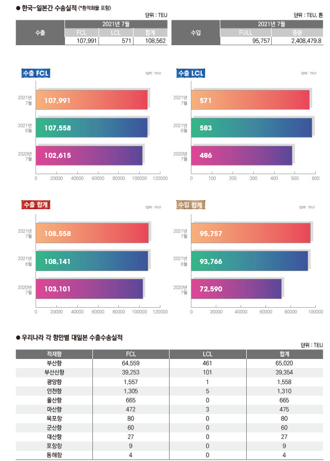 정기항로브리핑/ 한일항로 컨테이너 수출수송실적(2021년 7월)