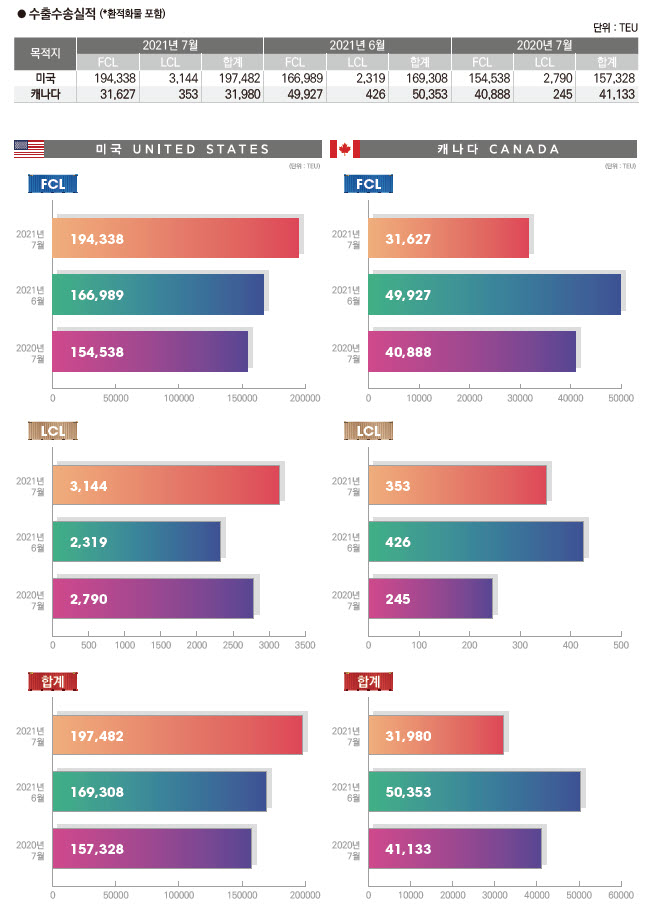 정기항로브리핑/ 북미항로 컨테이너 수출수송실적(2021년 7월)