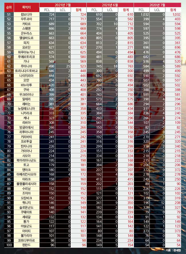 정기항로브리핑/ 월간 국가별 컨테이너 해상 수송 실적 51~100위 (2021년 7월)