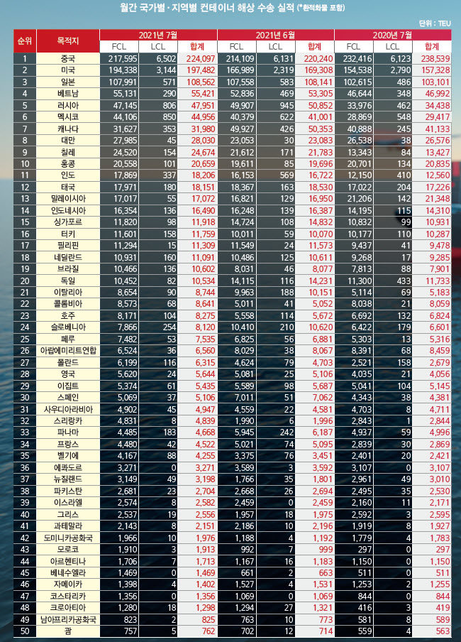 정기항로브리핑/ 월간 국가별 컨테이너 해상 수송 실적 1~50위 (2021년 7월)
