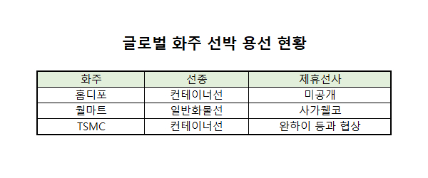 대만 최대 반도체 제조회사인 TSMC도 선박을 통째로 빌려 화물을 수송하는 방법을 검토하고 있다. 현지 외신에 따르면 이 회사는 에버그린 양밍해운 완하이라인 등의 자국 해운사에서 용선할 계획으로, 이미 완하이라인과 접촉해 관련 내용을 협의한 것으로 알려졌다.