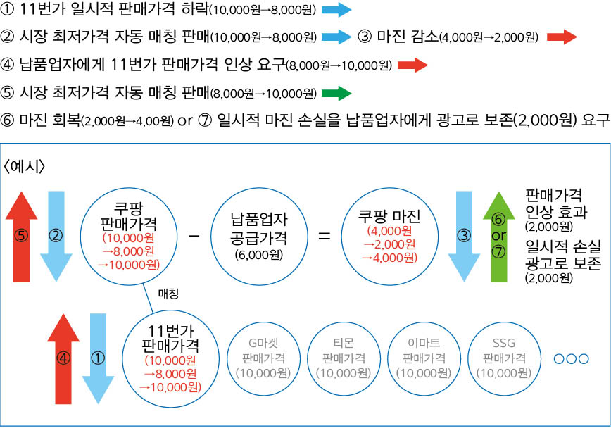 쿠팡은 2017년부터 2020년 9월까지 자신의 경쟁 온라인몰에서 일시적 할인판매 등으로 판매가격이 하락하면 총 101개 납품업자에게 경쟁 온라인몰의 판매가격 인상을 요구했다. 2016년 경부터 온라인 시장에서 자신의 경쟁 온라인몰인 이마트 11번가 G마켓 등이 판매가격을 낮추면 곧바로 자신의 판매가격도 최저가에 맞춰 판매하는 최저가 매칭 가격정책을 운용해왔다.