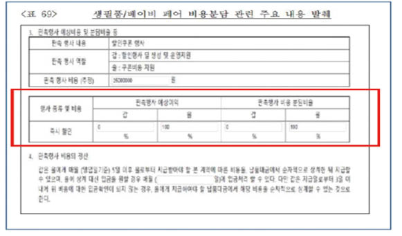이뿐만이 아니다. 2018년부터 2019년 상반기까지 일정 기간 소비자들에게 다운로드 쿠폰 등 할인 혜택을 주는 방식으로 베이비, 생필품 페어 행사를 기획하고 시행하면서 행사에 참여한 총 388개 납품업자에게 할인비용 약 57억원을 전액 부담하도록 했다. 납품업자 등의 판매촉진비용 분담 비율이 50%를 넘어서 대규모유통업법 제11조 제4항에 위반하는 행위에 포함된다.