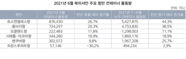 프린스루퍼트항을 뺀 북미 서안 주요 항만의 6월 컨테이너 물동량이 성수기 수요에 힘입어 증가세를 나타냈다. 특히 로스앤젤레스(LA) 롱비치(LB) 오클랜드 등 서안 남부(PSW) 3개 항만은 모두 두 자릿수 성장률을 보였다.