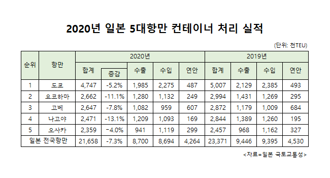 지난해 일본 항만에서 처리한 컨테이너 물동량이 7% 감소한 것으로 집계됐다. 일본 국토교통성에 따르면 2020년의 일본 전국 항만의 컨테이너 처리량(잠정치)은 2165만8000만TEU를 기록, 2019년의 2337만TEU에서 7.3% 감소했다.