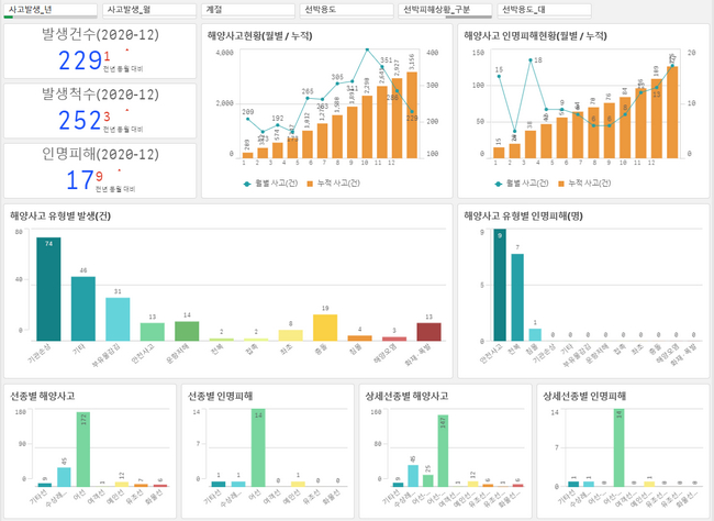 공단은 수요자 접근성이 용이한 웹기반 맞춤형 BI 솔루션을 활용한 대시보드를 통해 해양사고 현황의 빠른 수집, 분석 및 시각화를 통해 이용자들이 각종 해양사고 정보를 직관적으로 확인하고 빠른 의사결정이 가능하도록 지원한다.