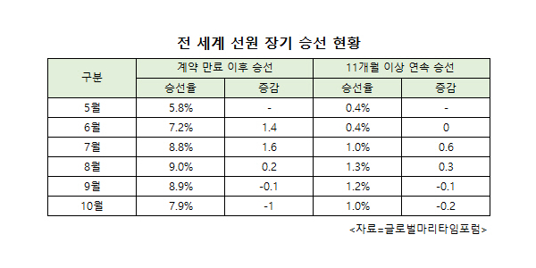 계약기간 종료 이후 배에서 내리지 못하는 선원 비중은 9월 8.9%에서 10월 7.9%로, 한 달 새 1%p 줄었다. 11개월 이상 연속 승선한 선원도 1.2%에서 1%로 소폭 감소했다.