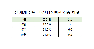 덴마크에 본부를 둔 국제 비영리단체인 글로벌마리타임포럼(GMF)은 전 세계 선원을 대상으로 코로나19 백신 접종 실태를 조사한 결과 10월 현재 31.1%의 접종률을 기록했다고 밝혔다. 지난달의 21.9%에 비해 9.2%포인트(p) 상승했다.