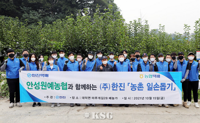 한진은 지난 15일 임직원 20 여명이 경기도 안성 과수 농가를 방문해 배수확 일손돕기 봉사활동을 실시했다고 밝혔다.