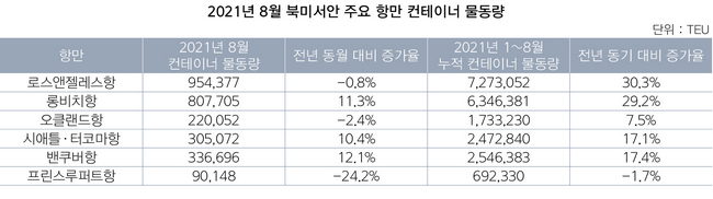 반면 로스앤젤레스(LA) 오클랜드 프린스루퍼트 등 3개 항만은 부진을 면치 못했다. 서안 항만의 혼잡이 가중되면서 선박 스킵(건너뛰기) 현상이 잦아져 물동량이 한풀 꺾였다는 분석이다.