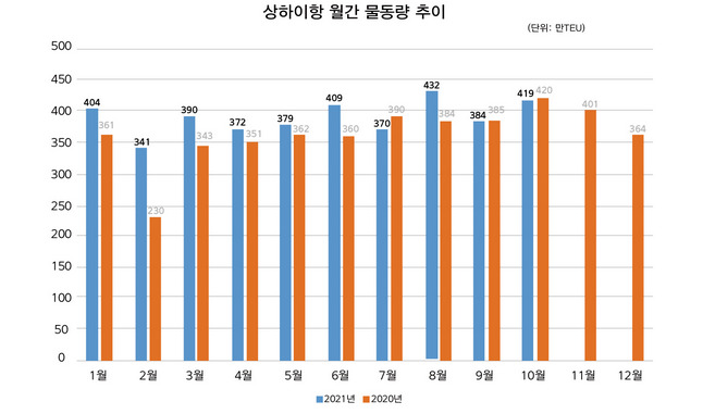 상하이국제항그룹(SIPG)에 따르면 상하이항은 10월 한 달 동안 419만TEU를 처리, 지난해 같은 달의 420만3000TEU에서 소폭(0.3%)의 감소세를 보였다. 9월 0.5% 감소한 383만5000TEU를 기록한 데 이어 두 달째 내리막길을 걸었다. 상반기까지 14.3% 늘어난 2293만9000TEU를 달성한 상하이항은 하반기 들어선 지난해의 코로나발 수요 부진 효과가 사라진 데다 중국의 전력난까지 겹치면서 성장률 둔화를 겪고 있다.