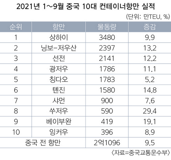 다만 1~9월 누계 실적에선 396만TEU의 잉커우항이 10위를 유지했다. 383만TEU의 르자오항은 11위에 머물렀다. 1위부터 9위까지 누계 실적 순위는 월간 실적과 동일하다.