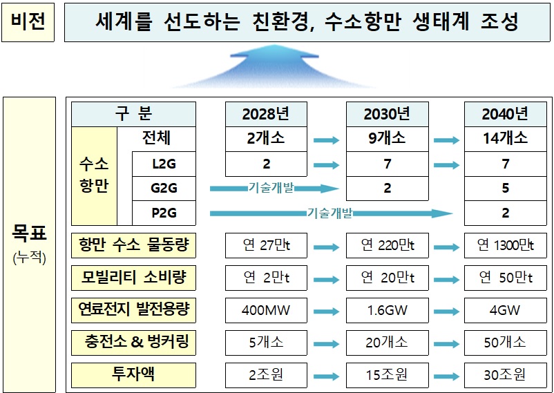 해수부는 ‘세계를 선도하는 친환경, 수소항만 생태계 조성’이라는 비전 아래, 2040년까지 총 14개소의 수소항만을 조성한다는 목표를 세웠다. 2028년 연간 27만t에 그치는 항만 수소 물동량을 2040년 연 1300만t으로 늘린다는 방침이다.