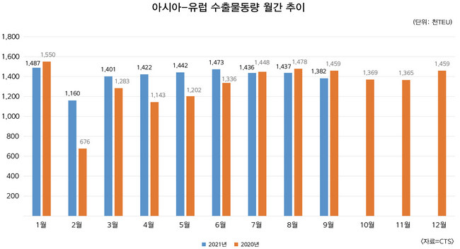 컨테이너트레이드스터티스틱스에 따르면 9월 아시아 16개국발 유럽 53개국행(유럽 수출항로) 컨테이너 물동량은 138만2000TEU를 기록, 지난해 같은 달의 145만9000TEU에서 5% 감소했다.