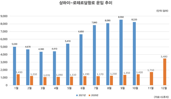 유럽항로 운임은 전달에 비해 소폭 하락세를 띠었다. 영국 드류리에 따르면 10월 평균 중국 상하이발 운임은 20피트 컨테이너(TEU) 기준 네덜란드 로테르담행이 8220달러, 이탈리아 제노아행이 7620달러를 기록했다. 지난해 같은 달의 1420달러 1540달러에 비해 각각 5.8배(479%) 5배(395%) 급등했다.