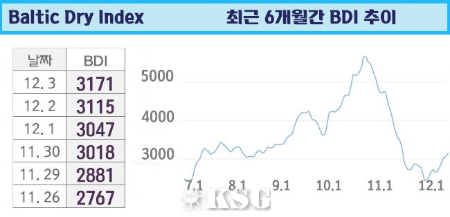 12월3일 건화물선 운임지수(BDI)는 전일보다 56포인트 상승한 3171로 마감됐다. 지난 주 벌크시장은 모든 선형에서 신규 수요의 유입이 늘어나면서 상승세로 마감됐다.