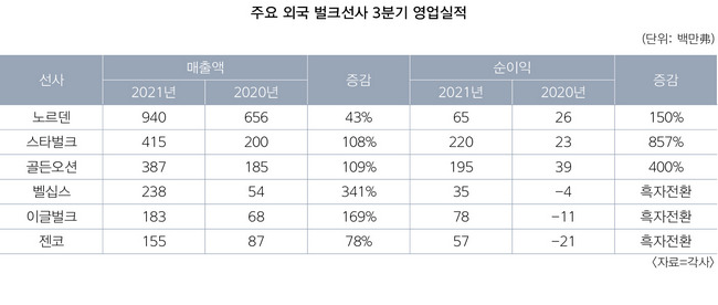 우리나라 팬오션이 3분기에 1800억원에 가까운 순이익을 낸 가운데 해외 벌크선사들도 모두 호성적을 거둔 것으로 나타났다.