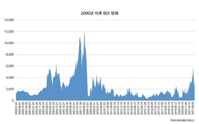 올해 3분기 벌크선운임지수(BDI) 평균은 3732포인트(p)로, 지난해 같은 기간의 1521에 비해 2.5배(145%) 급등했다. 1374로 올해를 시작한 BDI는 우상향곡선을 그리며 지속적으로 상승해 지난 10월7일 5650으로 정점을 찍은 뒤 약세로 전환했다. 10월7일자 지수는 리먼브러더스 파산 사태로 벌크선 시황이 곤두박질 치던 2008년 9월4일(5874p) 이후 13년 만에 최고치를 찍었다. 벌크선지수는 지난달 17일 2430으로 바닥을 친 뒤 반등해 이달 7일 현재 3352까지 올랐다.