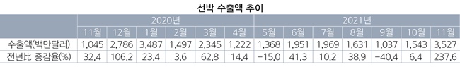 산업통상자원부에 따르면 우리나라의 11월 선박 수출액은 약 35억2700만달러(약 4조1700억원)를 기록, 전년 동월 10억4500만달러 대비 238% 급증했다. 선박 수출액은 2개월 연속 증가했으며, 2017년 7월 이후 4년 4개월 만에 최고치를 달성했다.