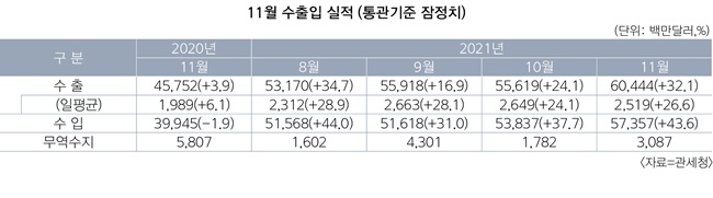 올해 11월 수출액은 전년 대비 32.1% 증가한 604억4000만달러(약 71조4100억원)로 집계됐다. 이는 집계를 시작한 1956년 이래 월간 최대 규모다. 기존 최고 수출액인 9월 559억2000만달러를 45억2000만달러 상회하며, 두 달 만에 최고치를 경신했다. 우리나라 수출액은 2013년 10월 500억달러 진입 이후 8년 1개월 만에 600억달러대로 도약했다.